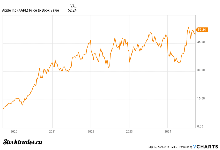 The price-to-book ratio falls short for many modern businesses. Look no further than the chart above, showing Apples 52X Price to Book.