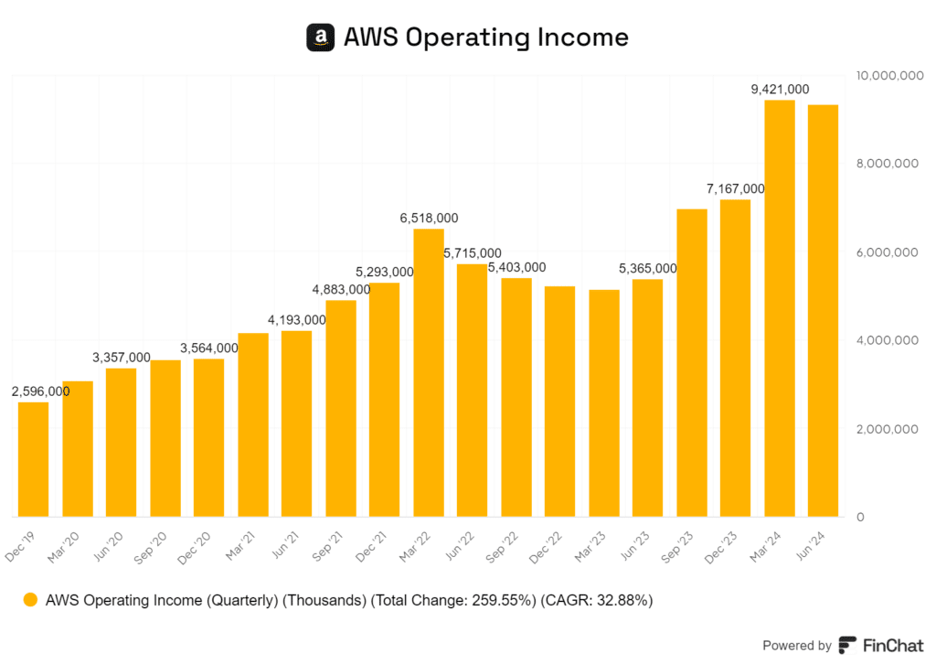 AWS is not just growing – it’s becoming more profitable too, with margins expanding significantly. Look at the chart below of the company’s operating income. It has nearly quadrupled from 2019 levels.