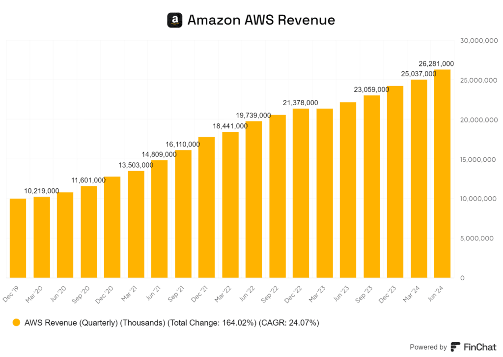 Amazon Web Services (AWS) continues to drive exceptional growth for the company. AWS sales jumped 19% to $26.3 billion, outpacing predictions and showing renewed momentum in cloud services.