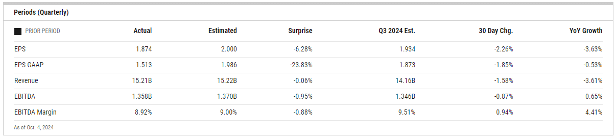 Magna International’s Q2 2024 results fell short of analyst expectations. The company reported adjusted EPS of $1.35, missing by $0.11 and revenue of $10.96 billion came in slightly below the $11.01 billion expected.