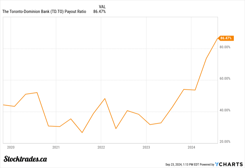 TD’s anti-money laundering issues have dealt a significant blow to its earnings. These regulatory challenges have resulted in substantial fines and one-off expenses, causing a sharp spike in the payout ratio.