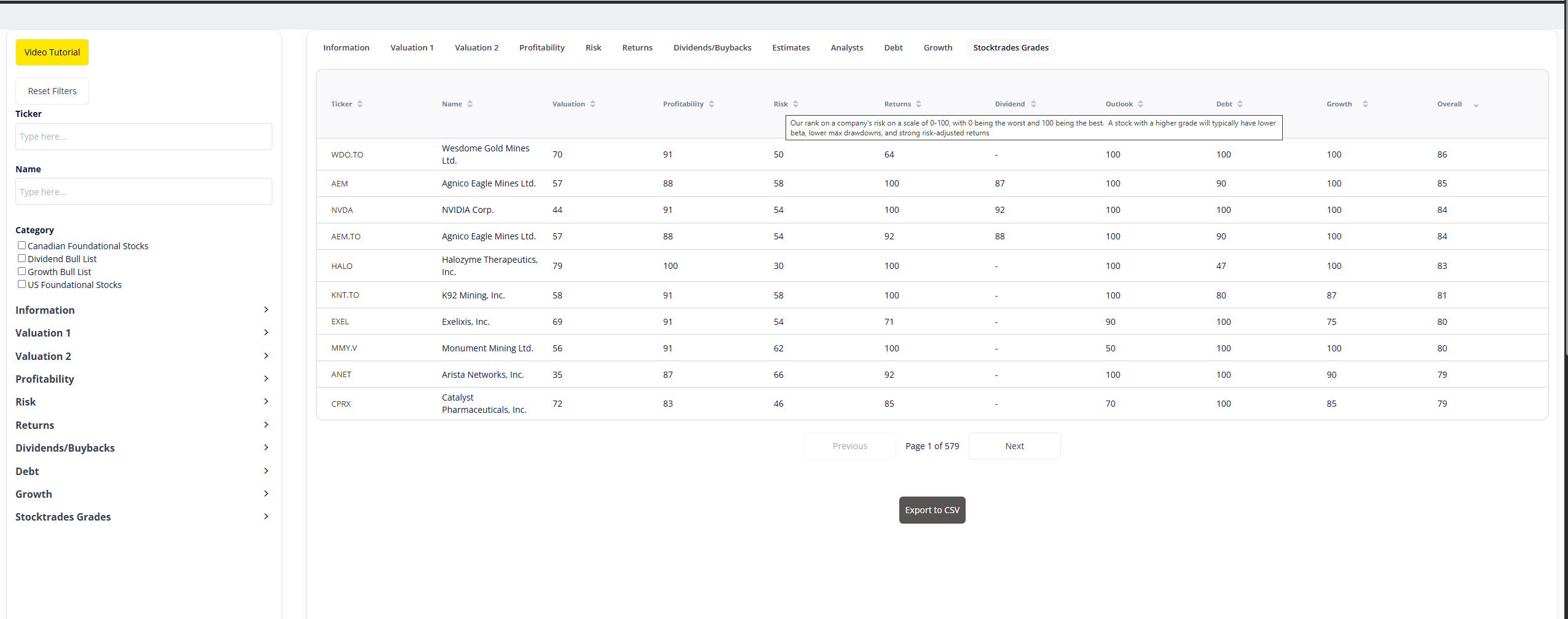 Is there somewhere that explains how the Focus area scores in the stock report are calculated and what they mean? Does 100 in the risk column mean very risky or not risky at all.