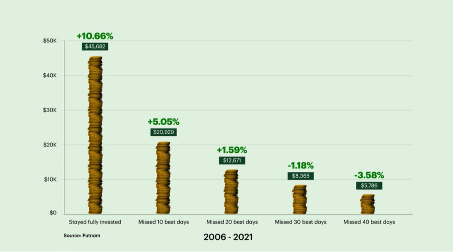 As you can tell by the chart above, missing just the 10 best days on the market in a 15-year timespan would have cut your annual returns by more than half. Just 10 days in 15 years, and your returns are half of what they’d be if you just stayed invested. Crazy to think about.