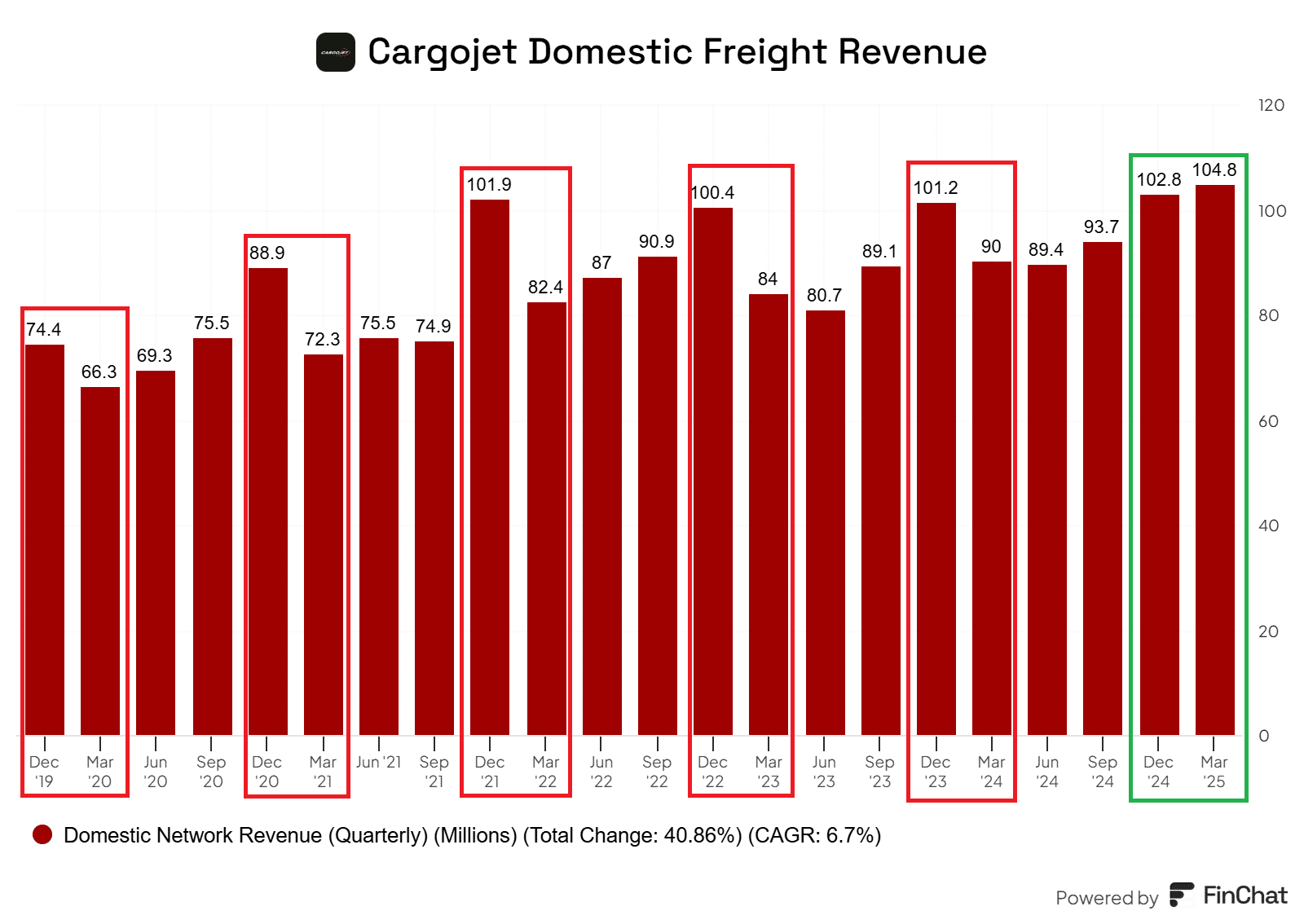 Domestic freight revenue. You will notice in the chart below that Cargojet follows a pretty predictable pattern. Q4 domestic freight volumes are higher, followed by a steep drop-off in Q1.
