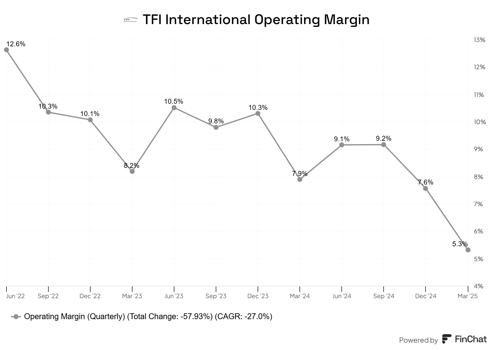 Margins are continuing to dip across the board as well, with less-than-truckload going from 10.9% to 6.9%, truckload 10.4% to 7.4%, and logistics 9.1% to 8.1%. The chart above will give you an idea on company-wide operating margins.