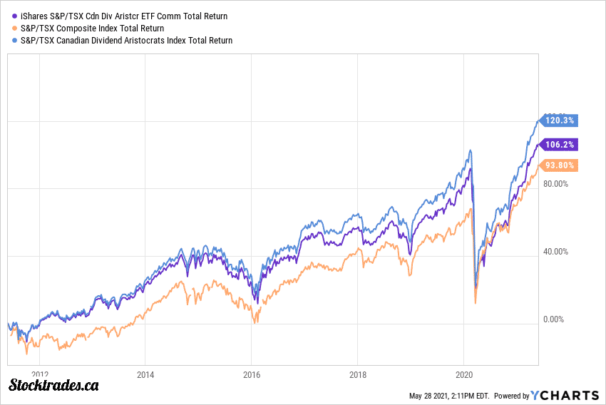 To compare whether or not dividend aristocrats here in Canada outperform the Toronto Stock Exchange, let’s look at the past performance since the inception of this TSX Canadian Dividend Aristocrats ETF and compare them to the Index itself.