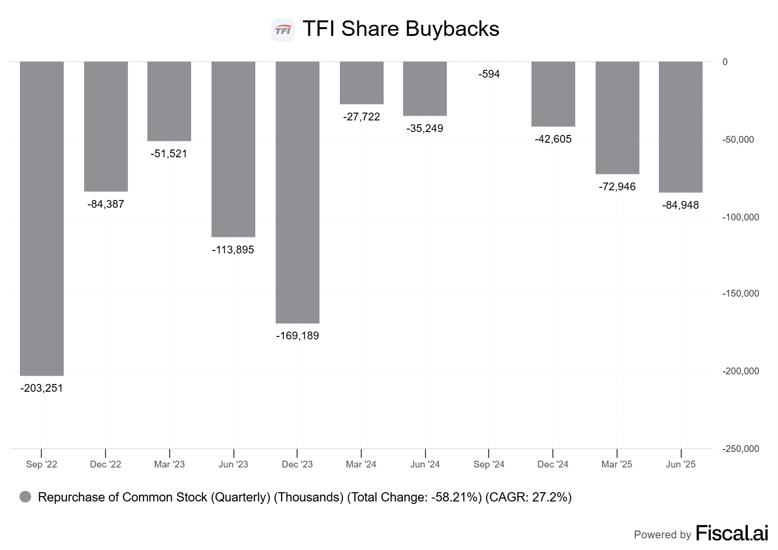 Not because they’re uneasy about deploying that capital, but because they believe that TFI itself provides the most value in the trucking industry right now. As a result, the company repurchased over 475,000 shares on the quarter and will continue to pursue aggressive buybacks throughout the year as its stock remains discounted. As you can tell by the chart below, buyback activity is ramping up.
