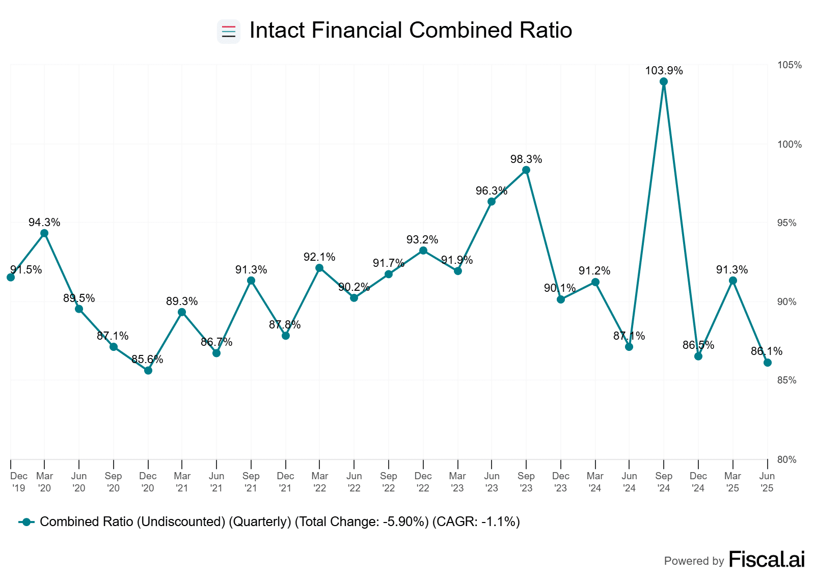 You’ll notice this combined ratio is much lower than Intact has normally reported over the last few quarters (see chart below), and this is primarily because the company did not have to pay out many catastrophe losses.