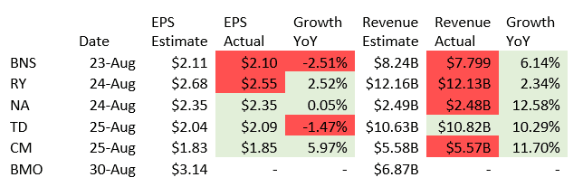 The worst performing bank of the week was the Bank of Nova Scotia as it shed 7.88%. Despite this, we do not believe it posted the worst set of earnings. We say this even though it missed on the top and bottom lines and posted lower year-over-year earnings. BNS is typically more volatile than the others as it has struggled with performance in recent years.
