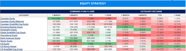 Let’s start with Canada. For the purpose of our report, we’ll focus on the Strategy Flow document as it reflects the combined outflows & inflows of both Mutual Funds and ETFs. For a more detailed breakdown, you can always check out the individual Fund Flows reports which we’ve linked above.