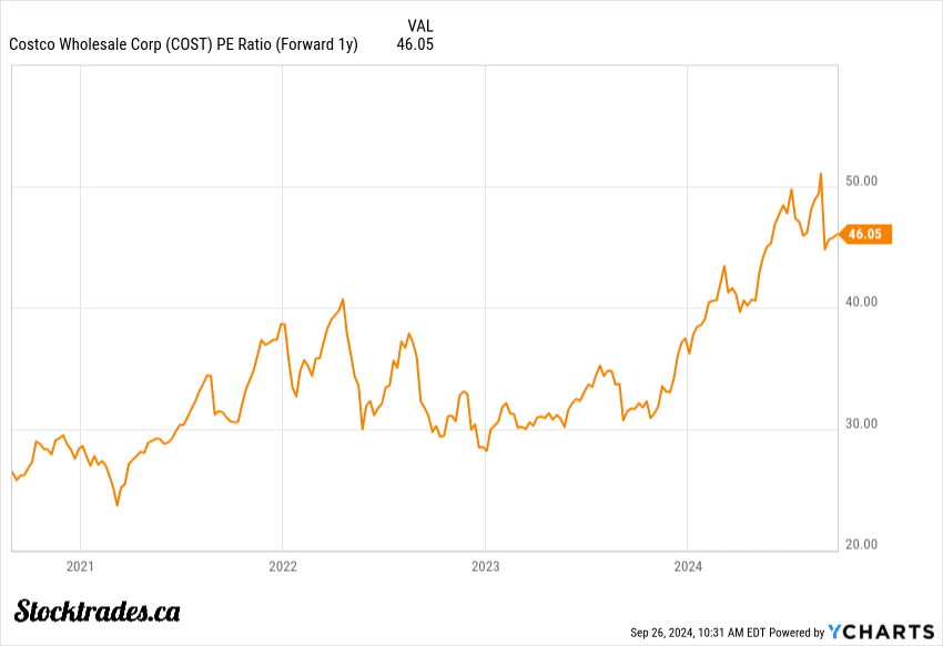Costco’s stock is quite pricey these days. The company’s price-to-earnings ratio is over 50, which is steep by any measure. When we look on a forward basis, it gets a bit better, but still pretty expensive at 46.