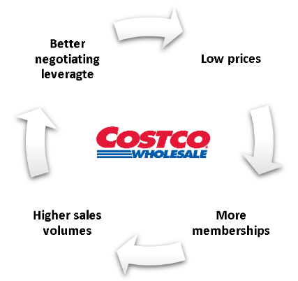 This low-cost strategy attracts more shoppers. As more people flock to Costco, their buying power grows when it comes to suppliers.