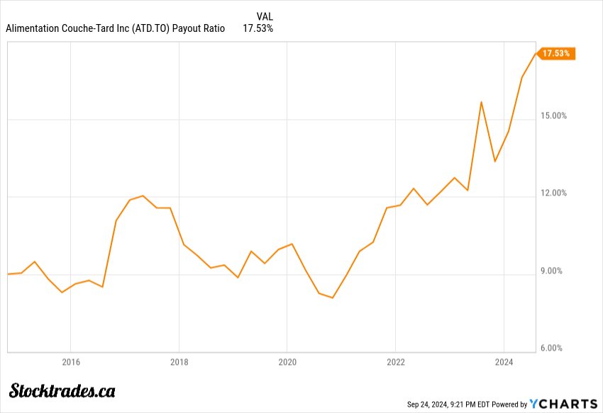 The company has consistently raised the dividend by double digits, and with payout ratios in the low teens, even if the environment gets worse for Couche-Tard, it has created a large buffer to continue that growth.