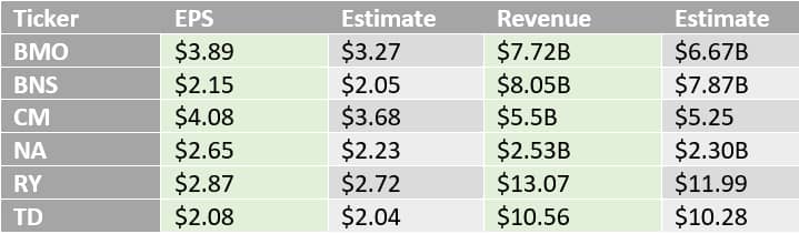 The banks put those concerns to bed. For the first time in a long time, all six of Canada’s banks beat on top and bottom lines. That’s right, not a single miss, not even just a match. They all beat.