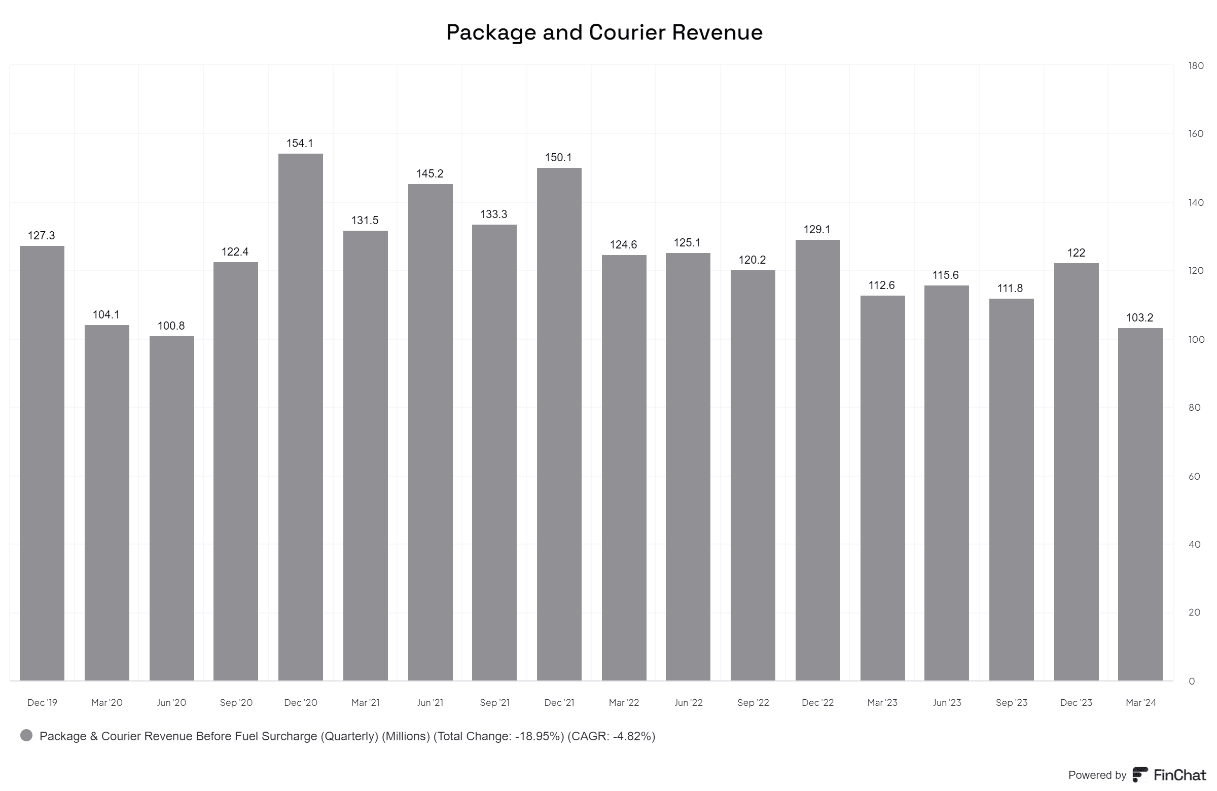 The reduction in Package and Courier revenue stands out the most. It is likely a result of a weaker Canadian and U.S. consumer. Less spending, particularly online, means fewer packages need to be shipped. Its Logistics segment saw some strong growth. However, this large growth is mainly attributed to an acquisition it made in 2023 of JHT Holdings. As the company merges into the fold, we will likely see Logistics revenue slow as well.