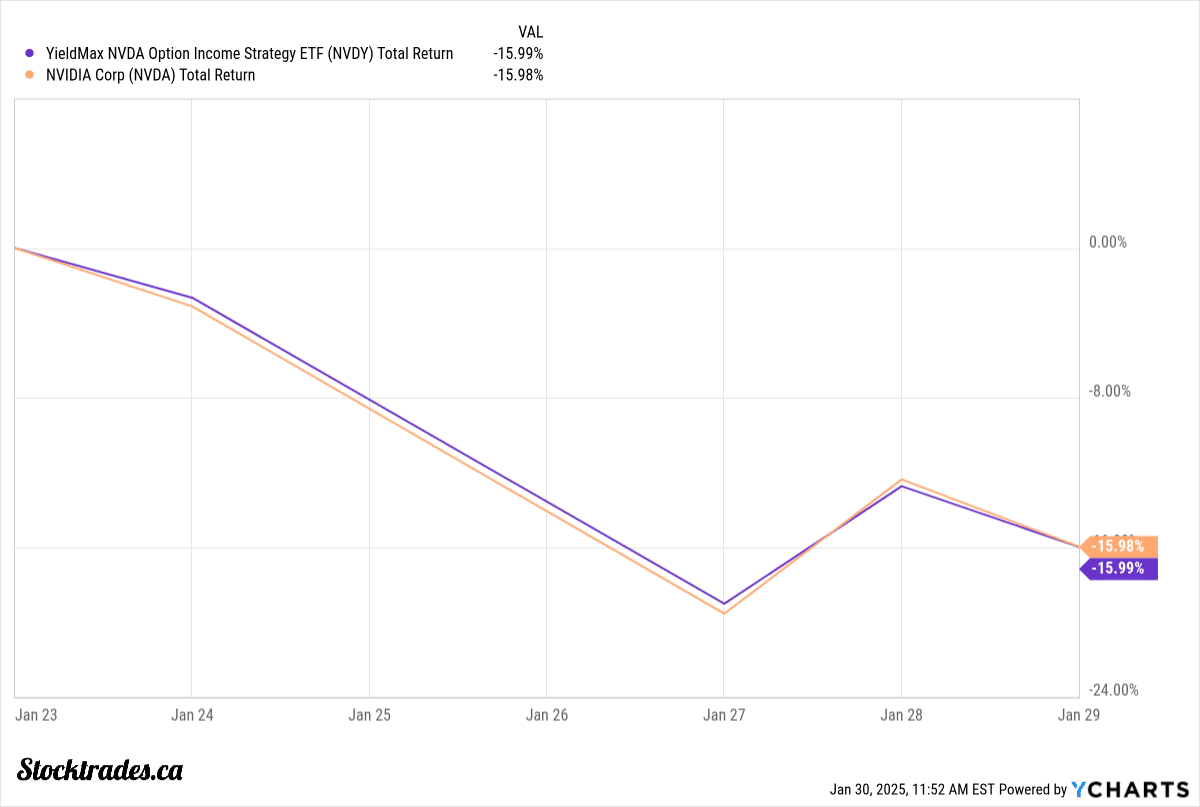 And when we look to the drawdowns of NVDA versus NVDY in the chart below, we can see they are exactly the same. There has been no protection to the downside.