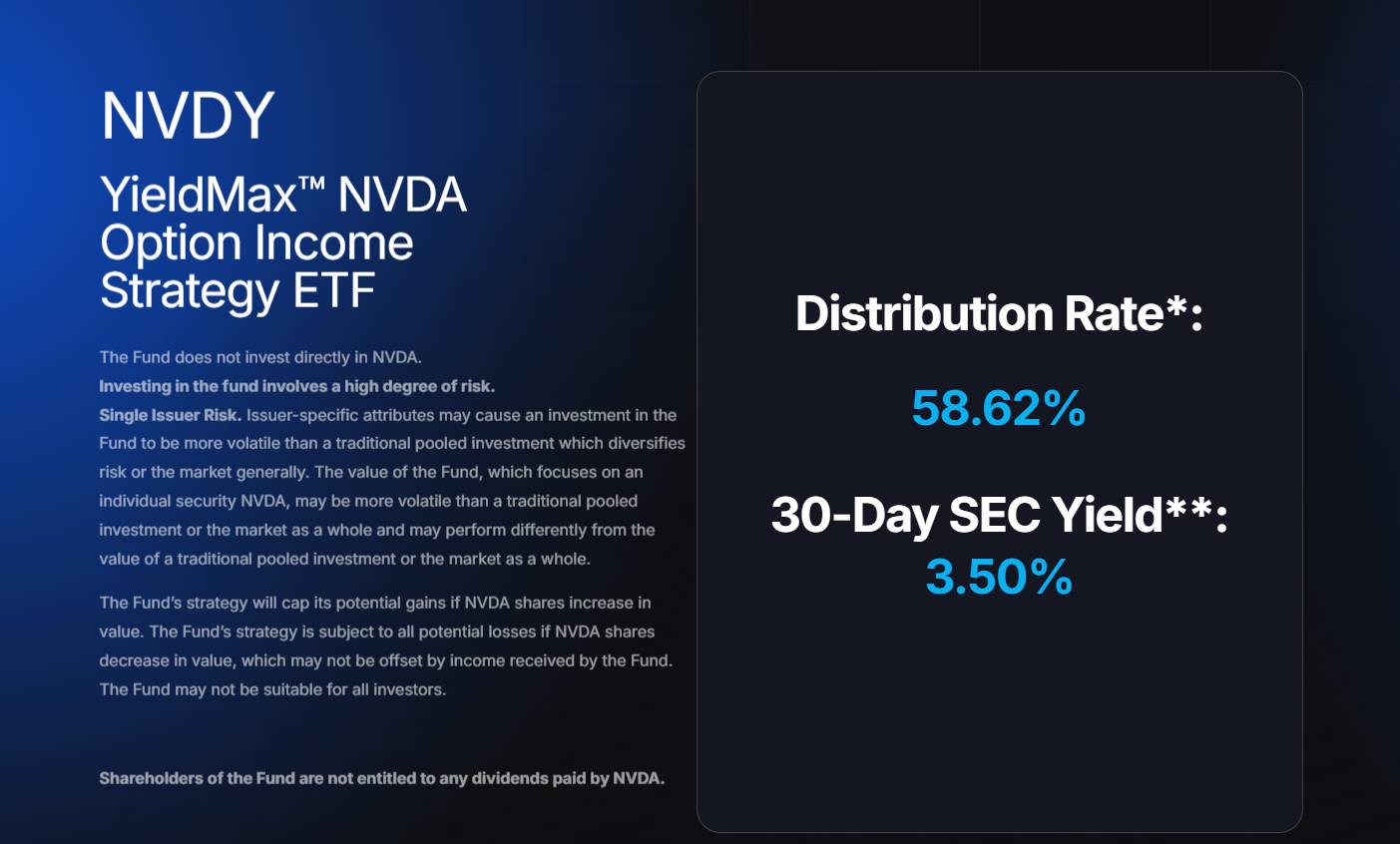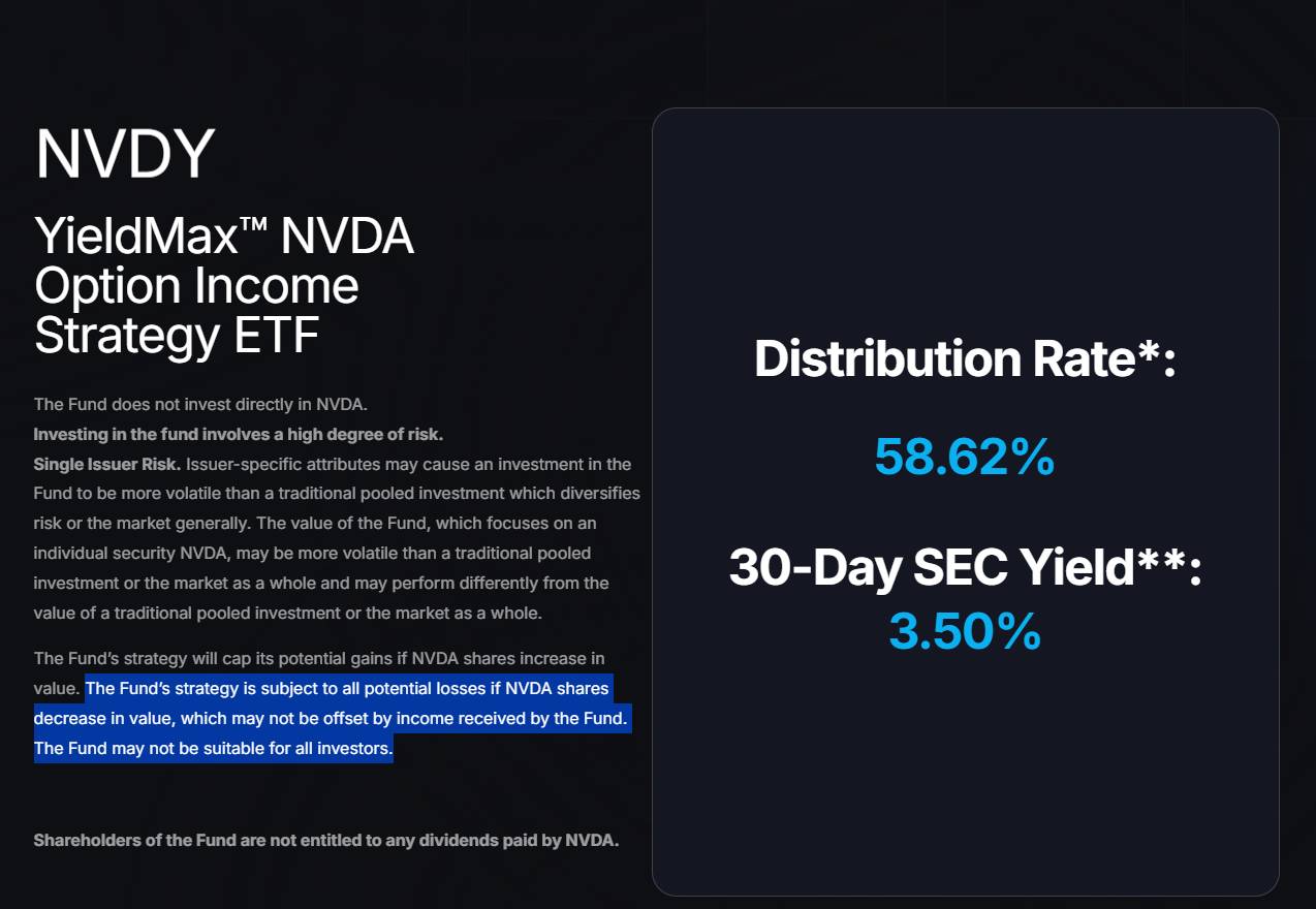There is a mentality among the passive income community that a bird in hand is worth two in the bush. Why expose yourself to the volatility of a company like Nvidia, one that pays a minuscule dividend, when you can get similar exposure and earn a 58% distribution (I’m not kidding on this; I’ve attached the distribution rate directly from Yieldmax in an image below).