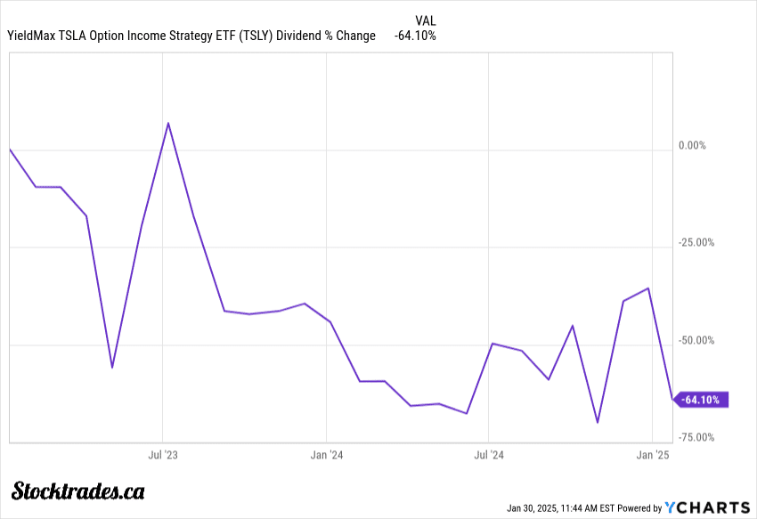Case in point? Let’s look to the Yieldmax Tesla ETF, trading under the ticker TSLY. Its distribution has been on a consistent path downward, falling by more than 64% since its inception.