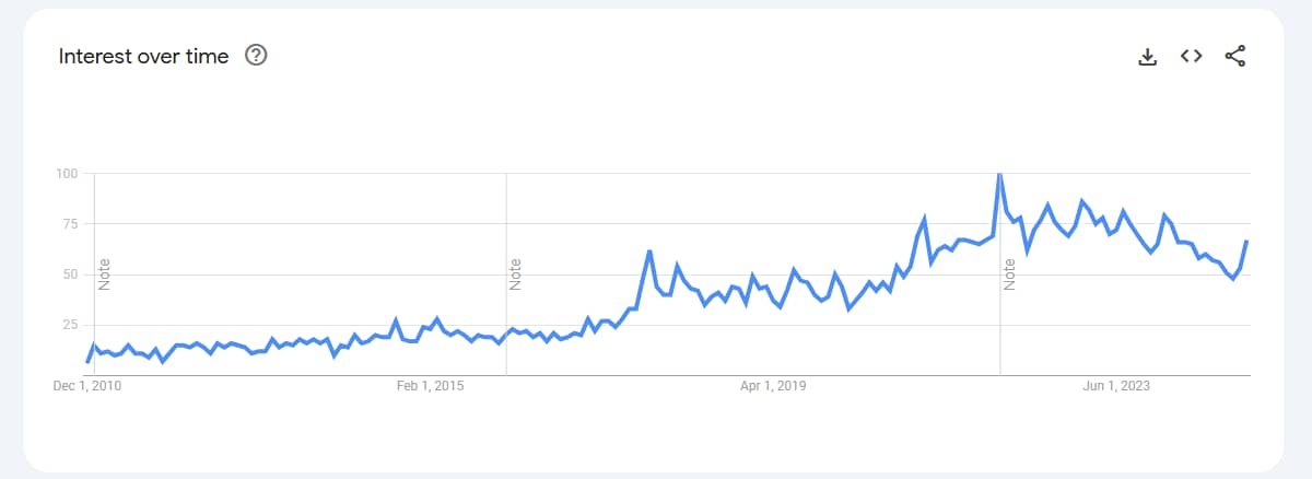 As you can see, especially during the pandemic, popularity of the term skyrocketed. The higher the blue line, the higher the interest.