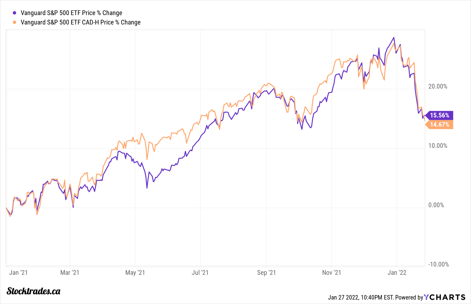 A prime example of this would be the strengthening of the Canadian dollar versus the US dollar in 2021. The rise of the CAD would have caused unhedged ETFs to underperform their hedged counterparts. We can see this in action in the chart below.