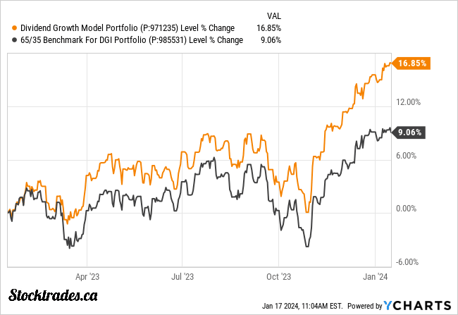 The dividend growth model is currently sitting on returns just shy of 17%, while its benchmark, a 60/40 blend of the TSX & S&P 500, has returned 9%.