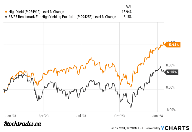 Because this is more yield-focused, the benchmark is a combination of VDY, a Vanguard Canadian High Yielding ETF, and SCHD, a popular U.S. dividend ETF. This benchmark returned 6.15%, whereas the High Yielding Portfolio returned just shy of 16%.