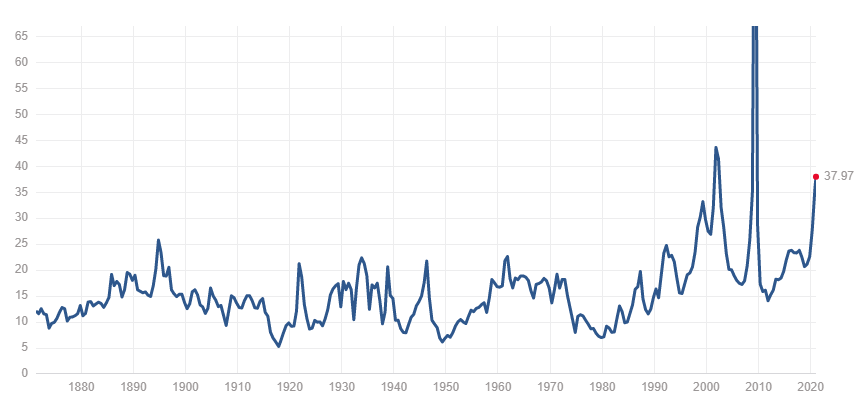 In fact, as I’m writing this article, the price to earnings ratio of the S&P 500 is 37.97. As you can see in the chart below, it typically hovers around the 15-20 range.