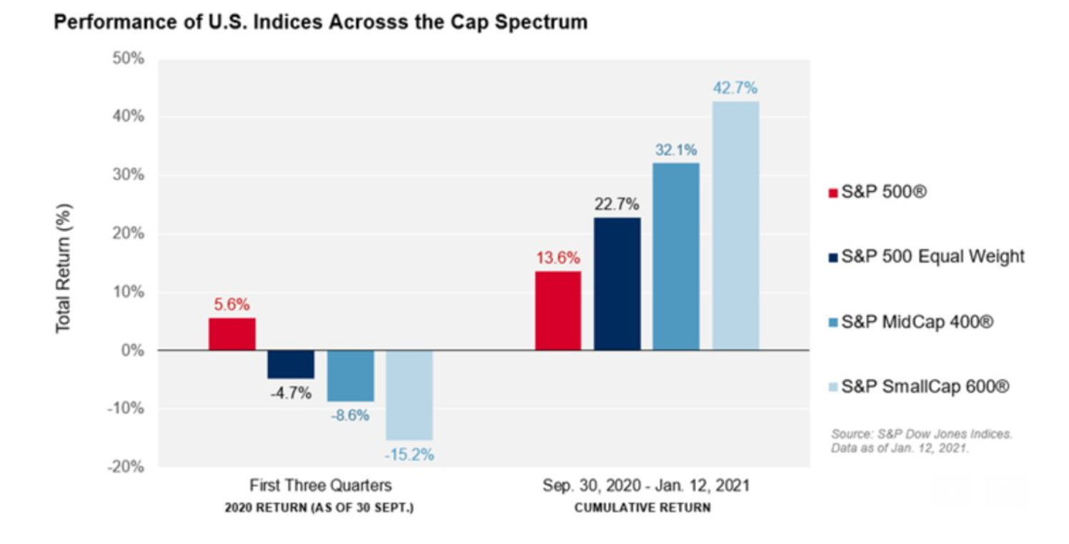 This chart highlights the fact that before the March 2020 crash, large cap stocks were carrying the brunt of the returns.