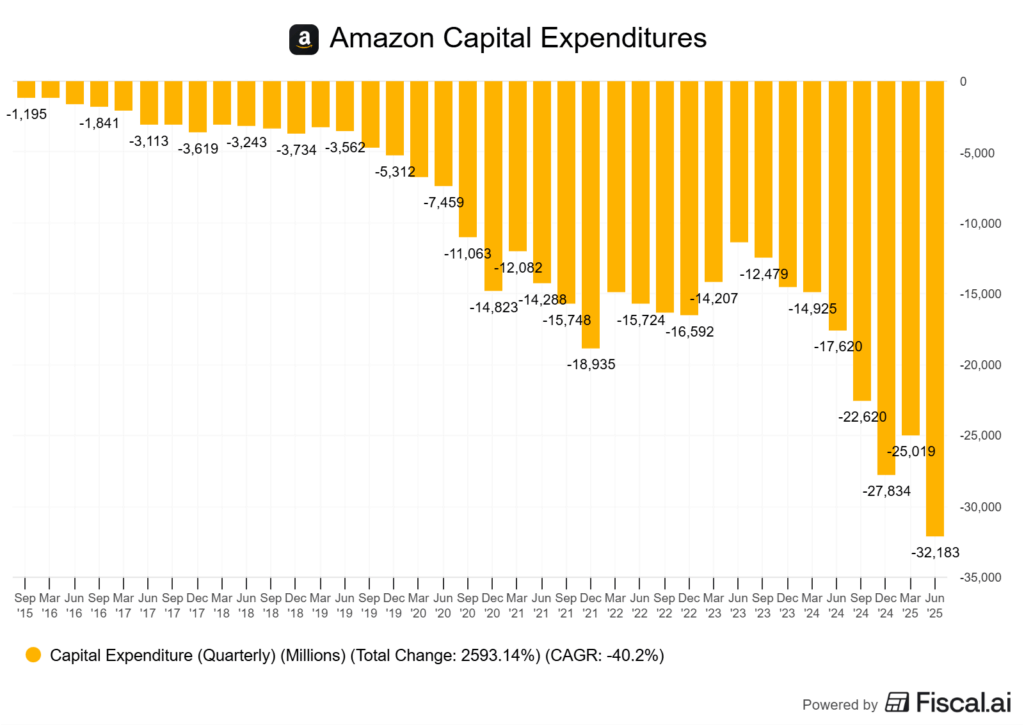 Amazon is spending at a scale few companies can match. In 2025, capital expenditures are set to reach about USD 100 billion, with most of it tied to AI, data centres, and logistics.