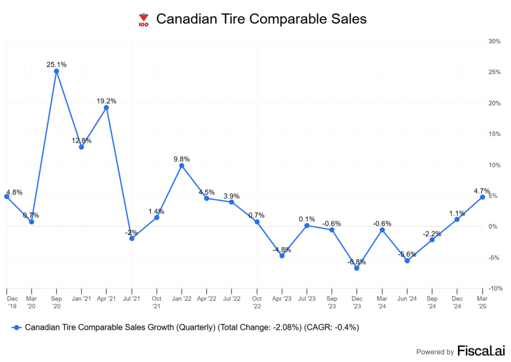 Rising Q1 sales are a big part of the story. The company posted a 4–5% bump in year-over-year revenues in the first quarter. That’s stronger than what we’ve seen from many Canadian retailers, giving Canadian Tire a bit of an edge compared to many discretionary retailers. Management stated it was from better e-commerce performance and its loyalty programs providing a bit of stickiness in terms of shoppers.