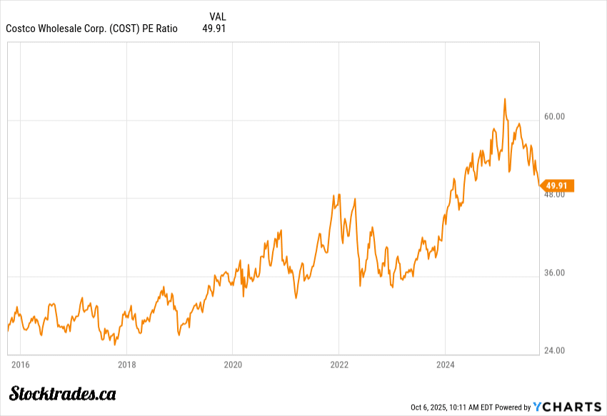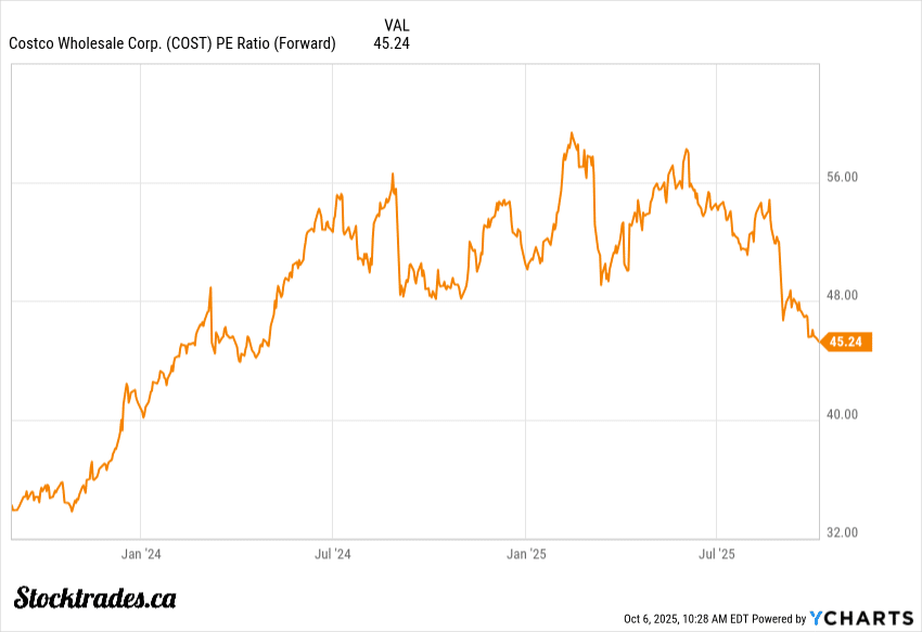 At roughly 50 times trailing earnings and near 45 times forward earnings, the valuation looks stretched compared with Walmart and Target. Those two trade closer to the mid‑20s. Yes, Costco’s flywheel deserves a premium valuation. But this much? It’s difficult to say.