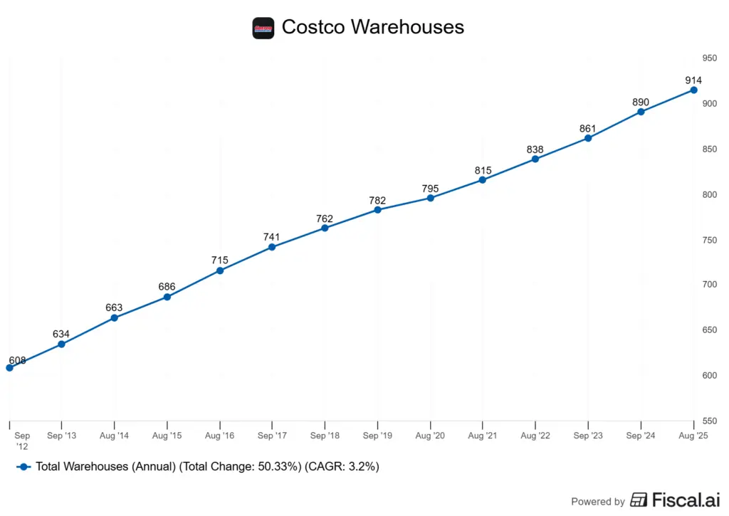 If same‑store sales slip below mid‑single digits for any extended period of time, I’d call that a sign of saturation pressure. For now, Costco’s footprint still expands efficiently, but it’s priced for near perfect execution.