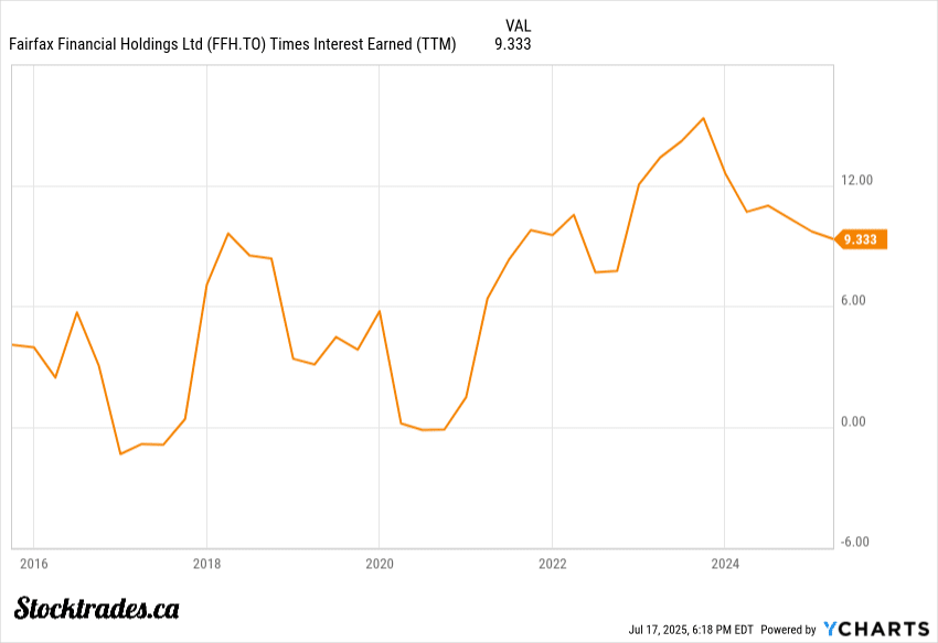 Unlike some insurers or conglomerates chasing yield by piling on leverage, Fairfax keeps their debt in check. Their interest coverage ratios remain well within the “comfortable” range.
