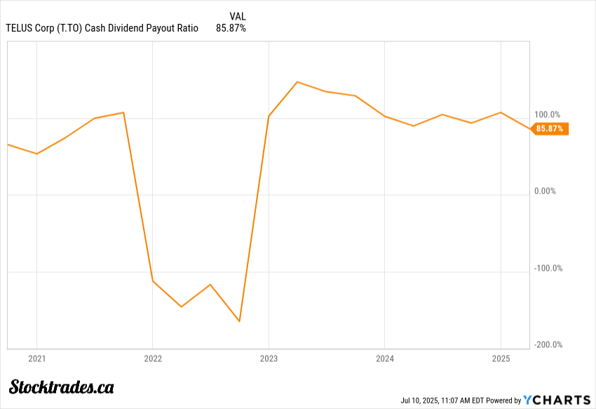 Typically, I expect safe TSX blue chips to keep their dividend payout below 75% of free cash flow (FCF). Telus’s payout ratio has been over and above this mark due to large capital outlays for years. However, it’s starting to come down now, but it’s still high at 85%.