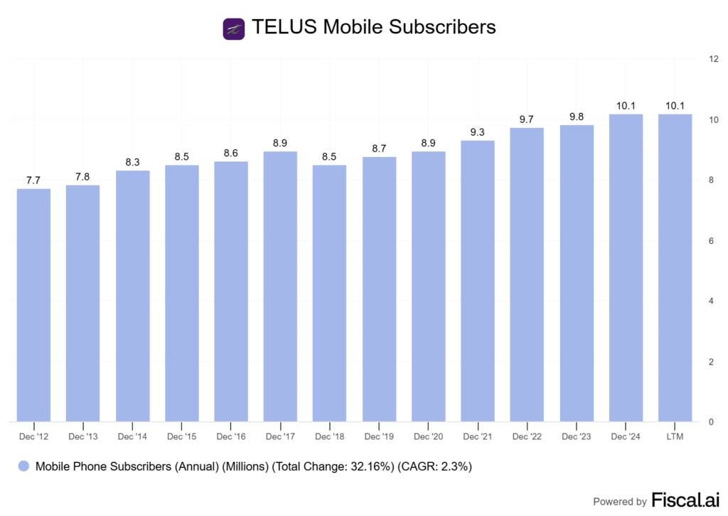 On the wireline front, Telus has lagged a bit in subscriber growth compared to the big players out east. Still, I respect their aggressive investment in fibre-to-the-home, especially across Western Canada. Being from Alberta, TELUS is definitely more prevalent here than the other major players.