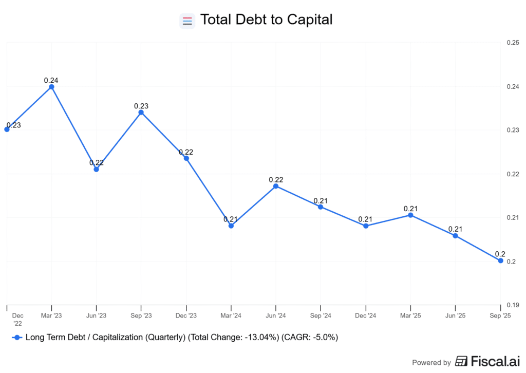 Debt to capital has finally normalized after acquisitions made in 2023, and is now sitting at lows.