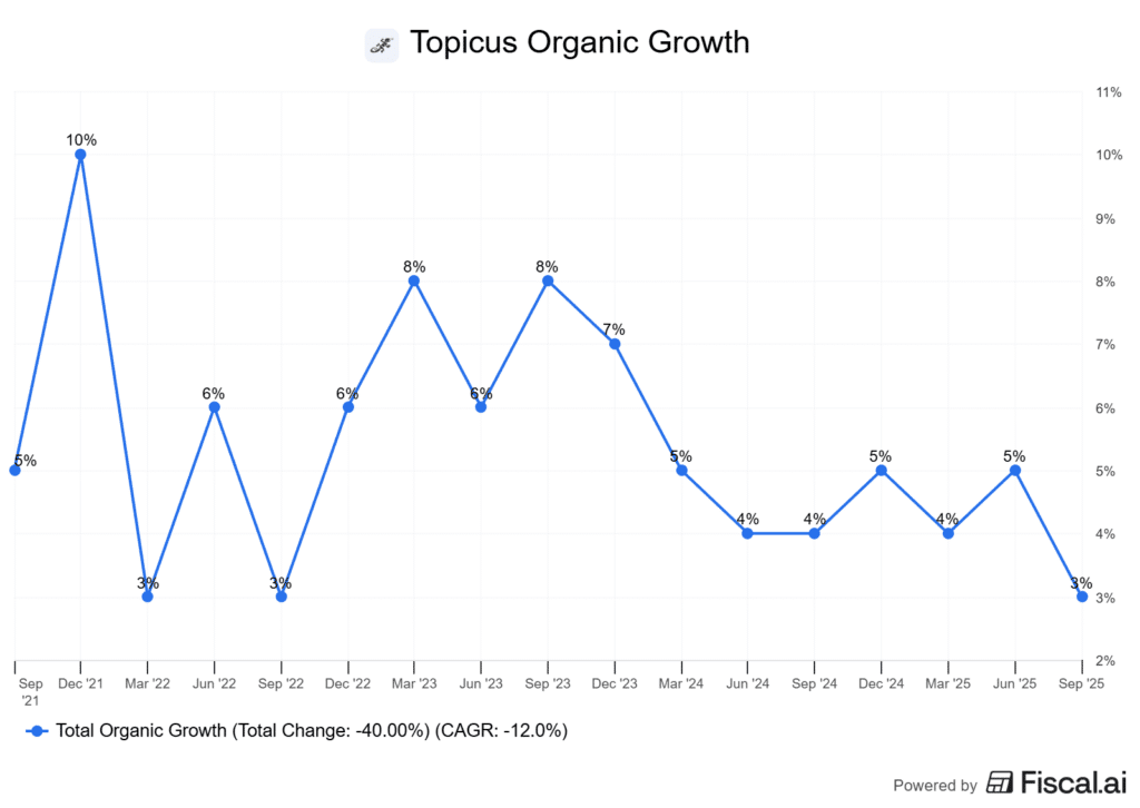 The problem? Even stripping that out, organic growth is hovering near the low end of historical averages (3–4%).