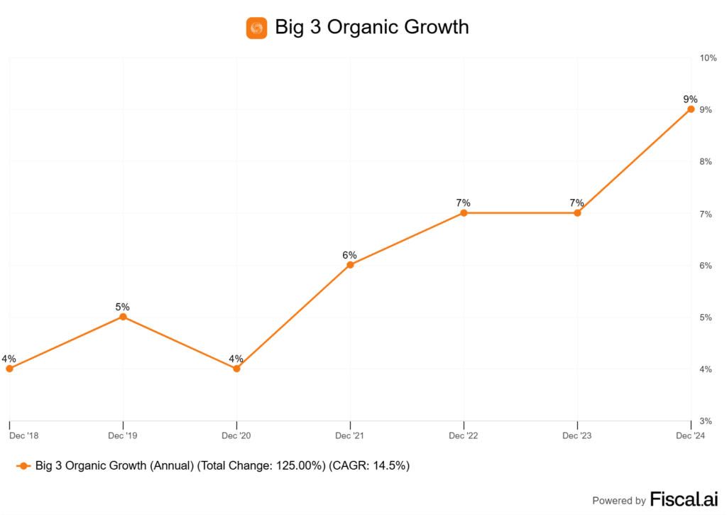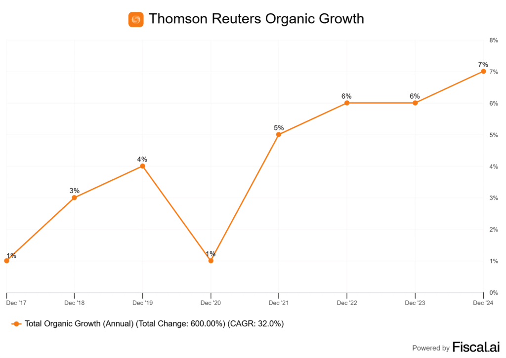 Thomson Reuters is not sitting on its hands. Management is guiding for organic revenue growth of 7–7.5 percent in 2025 and bumping up its estimates to 7.5–8 percent in 2026. As you can tell by the chart below, this would be above typical numbers.