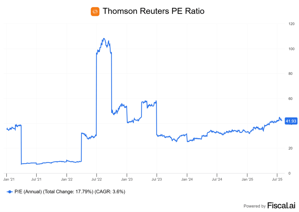 Thomson Reuters stock isn’t cheap by any measure. As of now, the shares trade at around 41x earnings.