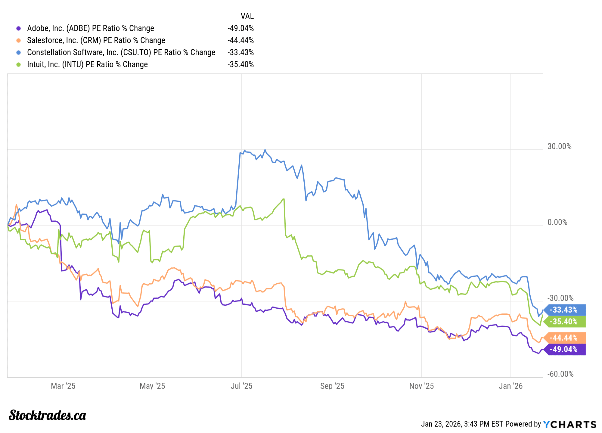 Companies like Intuit, ServiceNow, Adobe, Constellation, Salesforce, and many others are already down double digits in 2026. For most, total drawdowns exceed 40%.