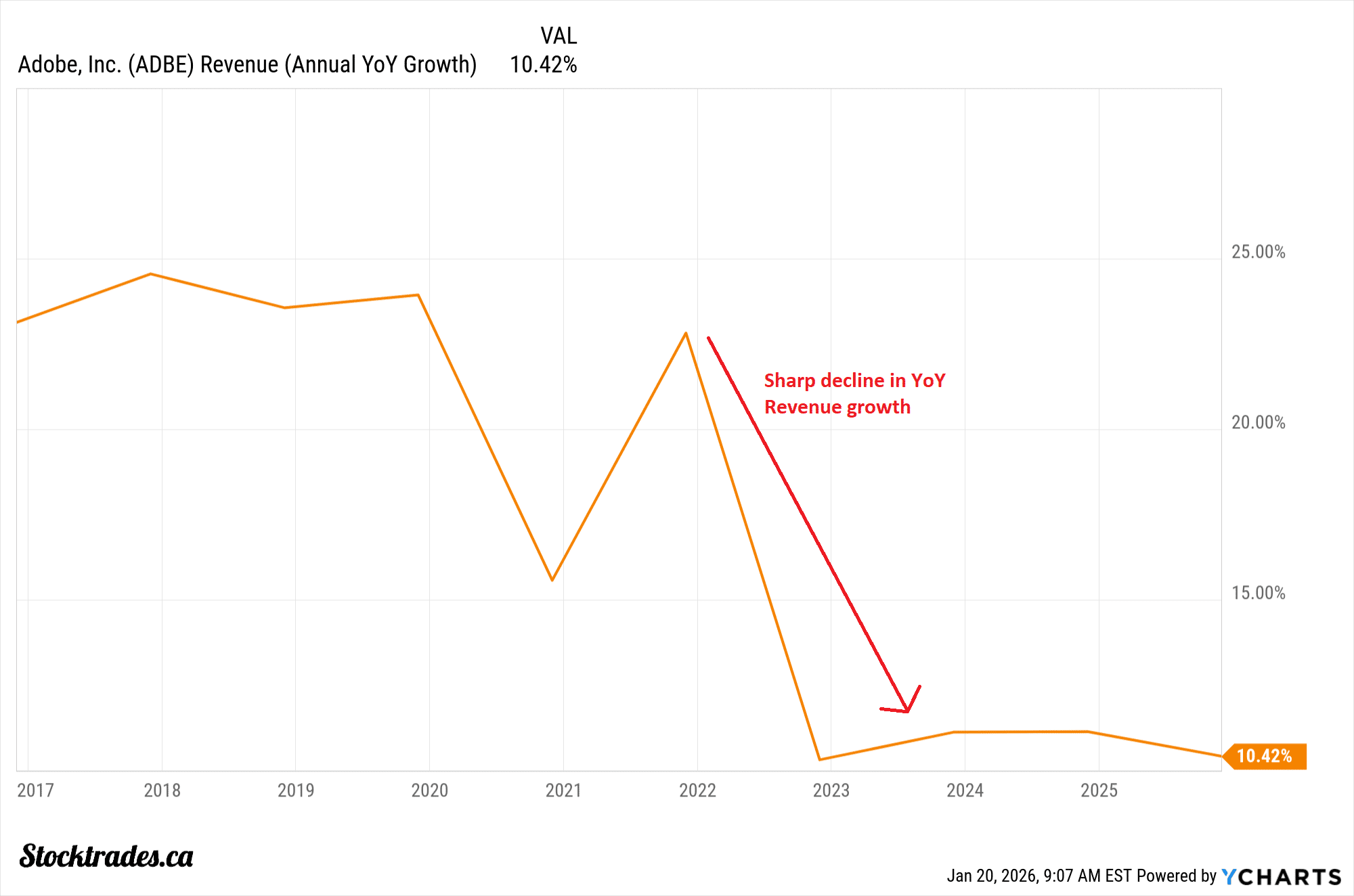Growth has slowed across the sector, there is zero question. Look below to the chart of Adobe again. A once 20%+ top-line grower, this has declined to 10%.