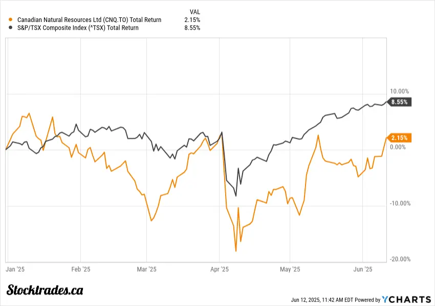 If we look to the chart above, you’ll notice one thing: the direct correlation between a multi-year slide in the price of WTI Crude Oil and a multi-year slide in Canadian Natural’s share price.