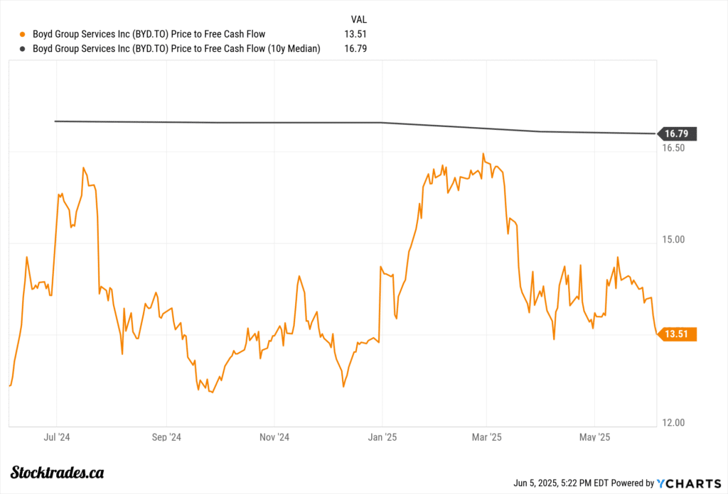 As I have mentioned previously, I believe the best way to value Boyd Group is on a price-to-operating cash flow basis and a price-to-free cash flow basis. Because the company is acquisition-heavy and equipment-heavy, it has a lot of depreciation and amortization on the balance sheet, which impacts earnings per share but not necessarily the actual cash flow generation of the company.