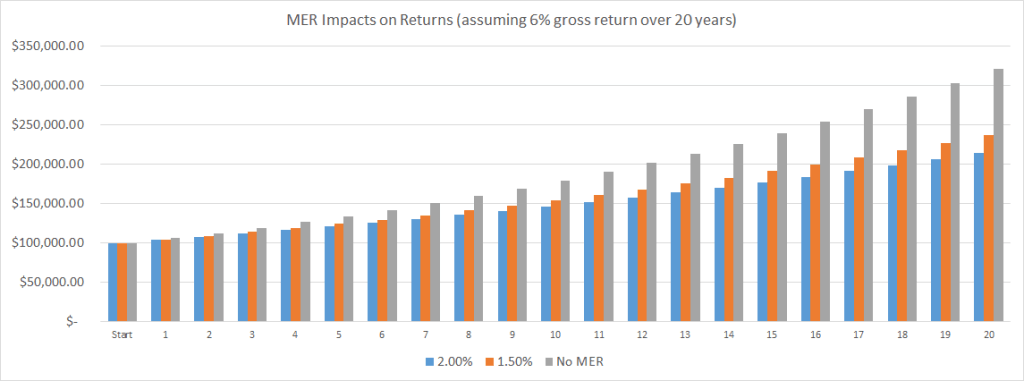 * This analysis simplifies a few things and therefore the math isn’t actually perfect: funds subtract fees daily, not annually; market returns are volatile day to day; most investors add to their portfolios over time; no management fees or MER at all isn’t feasible, there are always trading costs, even if you buy equities directly. Doing the math isn’t really feasible without having access to the day to day workings of the fund, but this chart gives you an idea of the impacts. Watch out for online calculators out there. They’ll never be perfect.