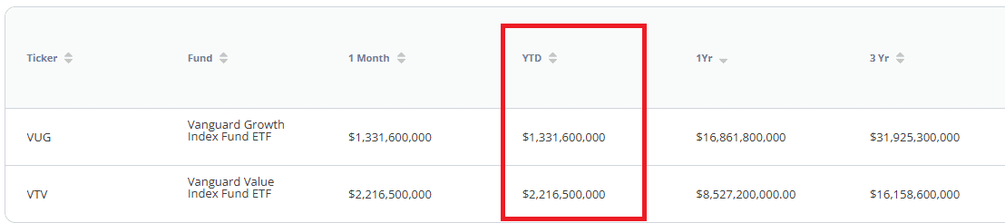 When we look to two popular US funds, the Vanguard Growth ETF (VUG) and the Vanguard Value ETF (VTV), we can see that over the last year, the Vanguard Growth ETF has commanded the lion’s share of inflows. However, over the last month or so, there has been a surge in inflows towards VTV, the value-based ETF.