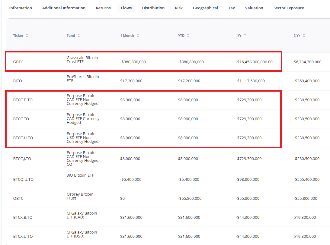 The creation of the iShares Bitcoin ETF (IBIT) south of the border has caused substantial outflows out of GBTC, to the tune of $16.5B over the last year.