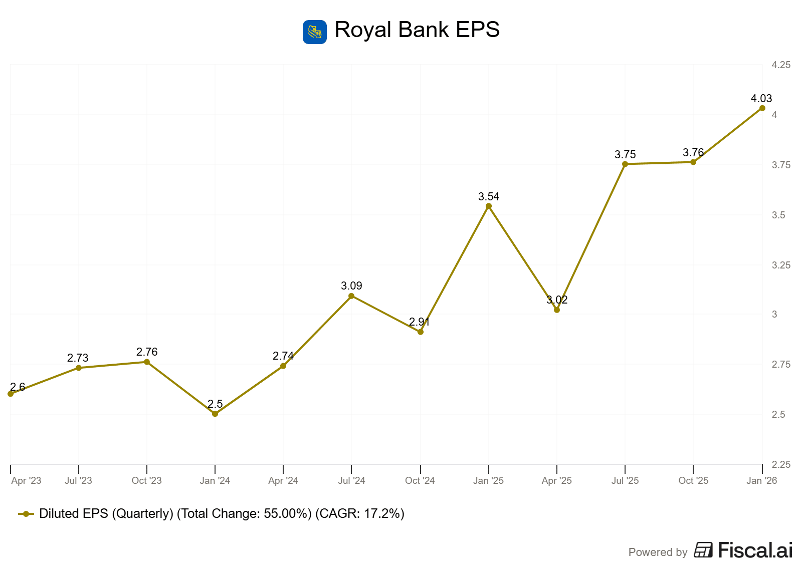 It’s also important to know that, as long-term investors, we don’t care when these situations arise. Great earnings, but the market expected more. Oh well, we are holding for the next decade anyway, who cares! If you look at a chart of Royal Bank’s earnings over the last 3 years or so, it’s an investor’s dream. Up and to the right.