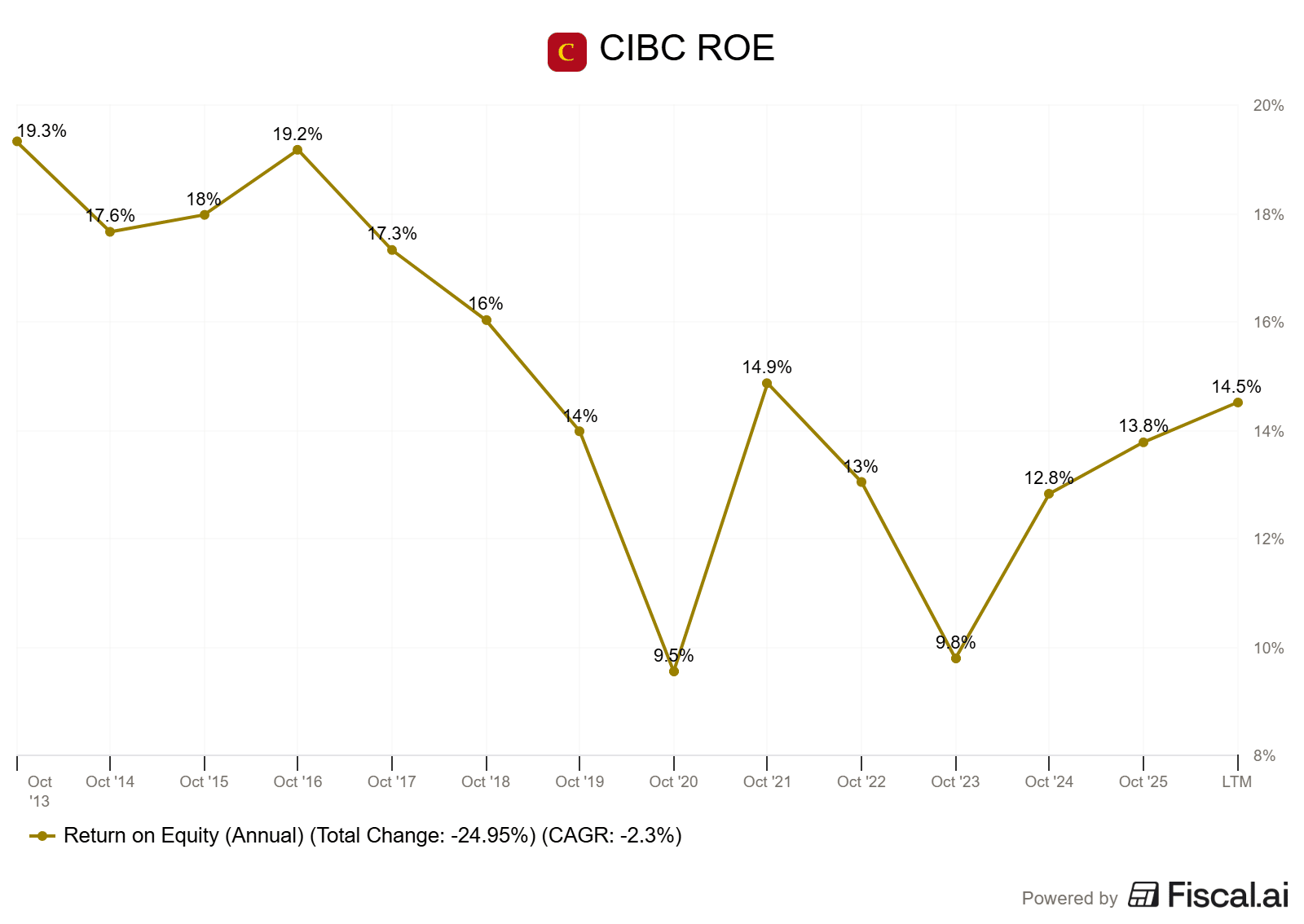 I will admit, CIBC was the bank I was hardest on for many years. Not because management was doing anything wrong or anything. But mostly because it just had way too much Canadian exposure. That Canadian exposure, all while avoiding many of the international issues that plagued banks like Scotia and BMO, has allowed CIBC to crush it.