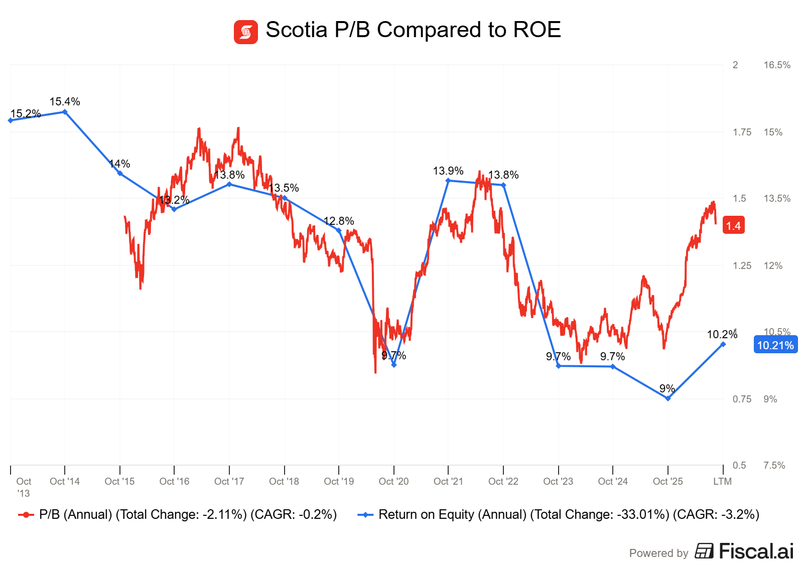 What does this mean? Well, if Scotia can continue to improve ROE and P/B, the stock price should follow.