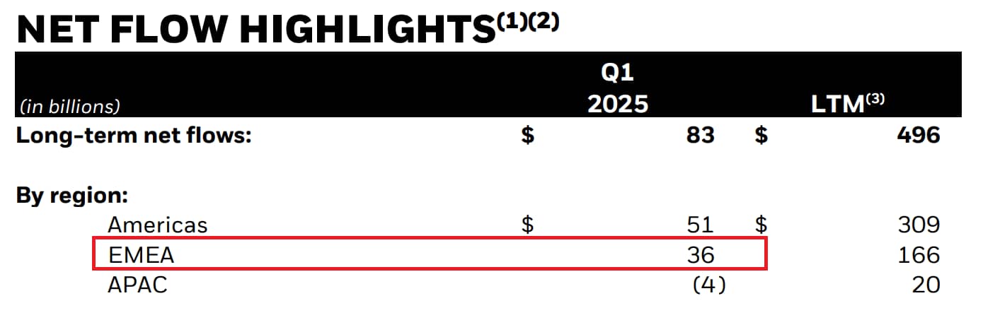 Below is a highlight from Blackrock’s quarter, which shows that out of the $83B in inflows, $36B, or 43.3%, are to EMEA.